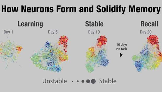 По сути, животные распознавали, где они находится относительно каждого уникального символа.Чтобы изучить, как со временем исчезают воспоминания, исследователи выпускали мышей в уже знакомый им лабиринт спустя 20-40 дней. Вернувшись, грызуны, у которых сформировались сильные воспоминания, закодированные большим количеством нейронов, быстрее вспоминали свою задачу. Несмотря на то, что некоторые нейроны проявляли различную активность, память мыши о правильном маршруте была четко идентифицирована при анализе активности больших групп нейронов. Другими словами, использование групп нейронов позволяет мозгу дольше хранить воспоминания, даже если некоторые из исходных нейронов замолкают или повреждаются.