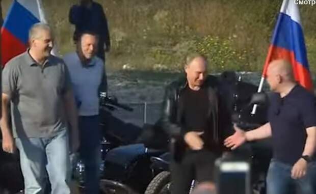 Вместе с лидером "Ночных волков" Александром Хирургом Залдостановым, сопровождавшем его на другом мотоцикле, президент подъехал прямо к сцене. Оттуда он обратился к участникам фестиваля.