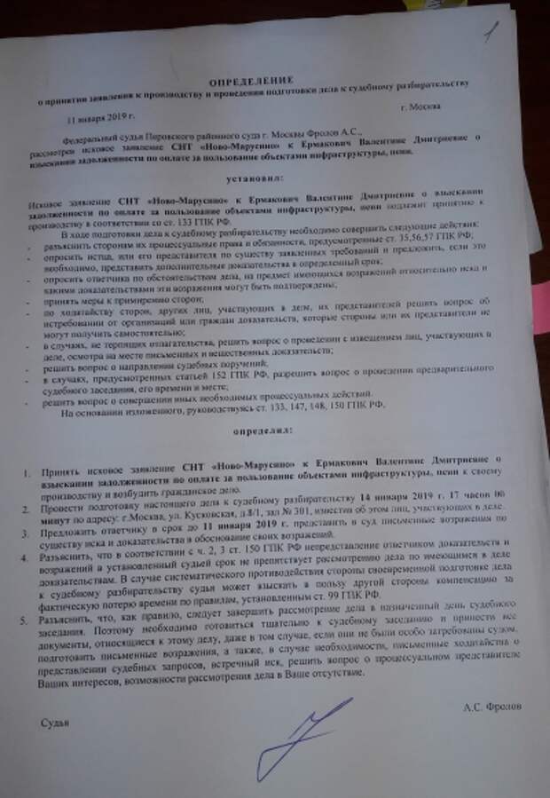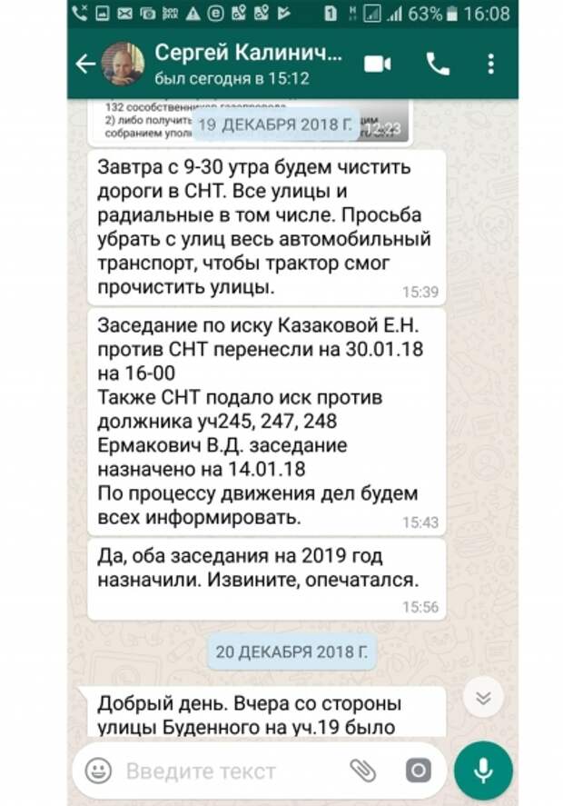 19 декабря 2018 г. В рассылке председателя СНТ «Ново-Марусино» из Люберецкого района Московской области Калиничева Сергея Юрьевича в WatsApp появляется сообщение: «…СНТ подало иск против должника уч. 245, 247, 248 Ермакович В.Д. заседание назначено на 14.01.18 По процессу движения дел будем всех информировать. Да, оба заседания на 2019 год назначили. Извините, опечатался». (Стиль и правописание автора сохранены – авт.).