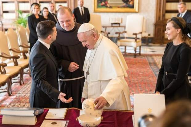 Украинский лидер Владимир Зеленский рассмешил Папу Римского Франциска в ходе своего визита в Ватикан. На кадрах, которые были опубликованы папским пресс-пулом видно, как президент что-то сказал понтифику, после чего он улыбнулся, а затем и рассмеялся.