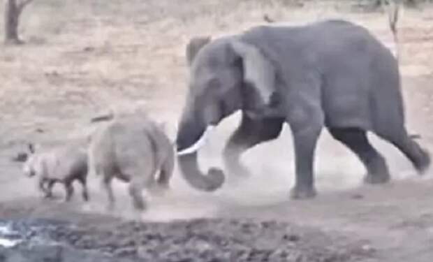Детеныш не успел среагировать и в один момент оказался между матерью и слоном, рискуя быть затоптанным. Однако ему удалось выбраться и отбежать на безопасное расстояние.Чуть позже и самка поняла, что силы неравны и решила убежать, но слон какое-то время преследовал животных, которым, однако, удалось все-таки уйти.